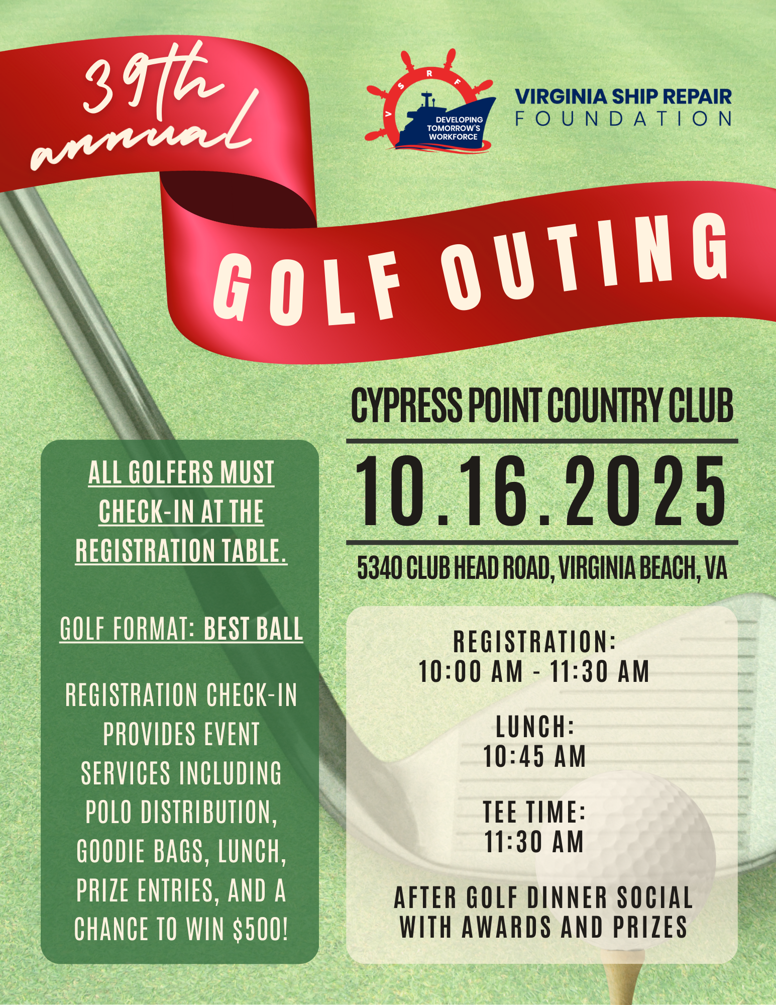 The 39th Annual VSRF Golf Tournament will be held on Thursday, October 16, 2025, at Cypress Point Country Club, 5340 Club Head Road, Virginia Beach, VA 23455.